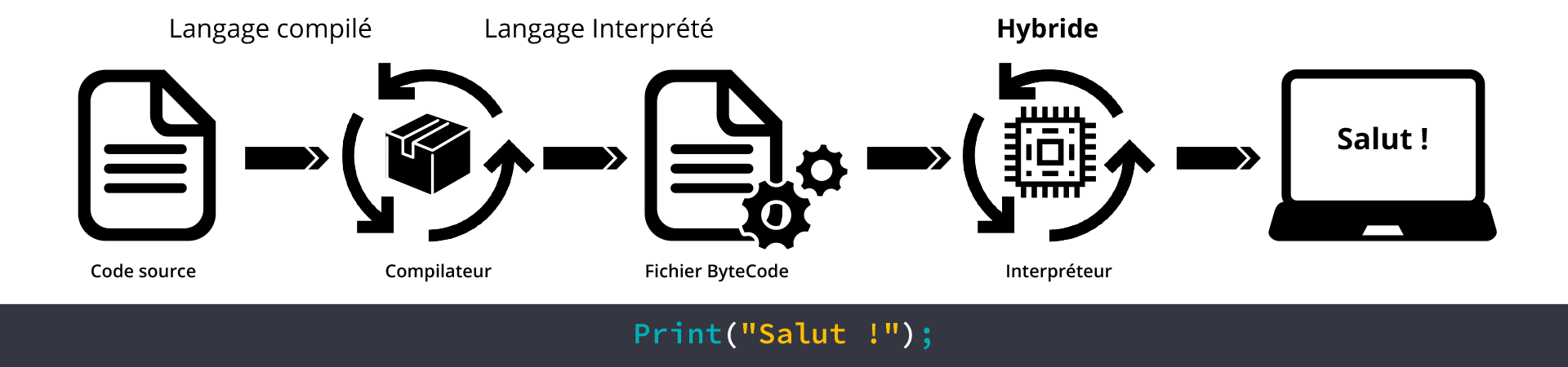 Python est un langage de programmation interprété, c’est-à-dire qu’un programme « interpréteur » permet d’exécuter les instructions demandées par le code Python sur n’importe quel ordinateur. Considéré comme « hybride », il ne dépend pas d’un système d’exploitation. En cela, il se rapproche de Java.