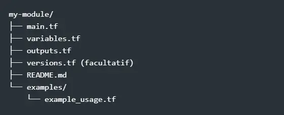 Le code Terraform pourra également être organisé en modules réutilisables. Dans ce cas, les modules devront suivre la structure de répertoires standard :