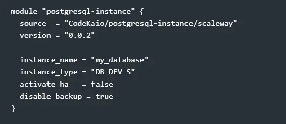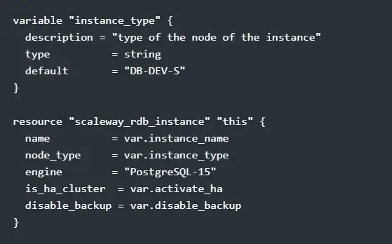 Les modules exposent des entrées et sorties, variables et outputs, dont les valeurs sont utilisées dans le code. Voici à titre d’exemple un extrait du code d’un module qui crée une base de données sur Scaleway (le code complet est disponible sur GitHub) :