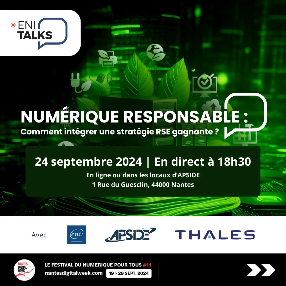 La NDW, c’est aussi l’occasion de mettre en avant l’indispensable numérique responsable : impacts sociétaux, environnementaux, éthiques ou encore économiques, nos pratiques numériques se doivent d‘être questionnées. Sujet plutôt récent, la Responsabilité sociétale des entreprises a fait avancer le débat. Avec trois de nos experts, le Groupe ENI, associé à Thalès et Apside, vous propose d’aller encore plus loin avec le 7e ENI Talks, webinaire en live en présentiel ou à distance.