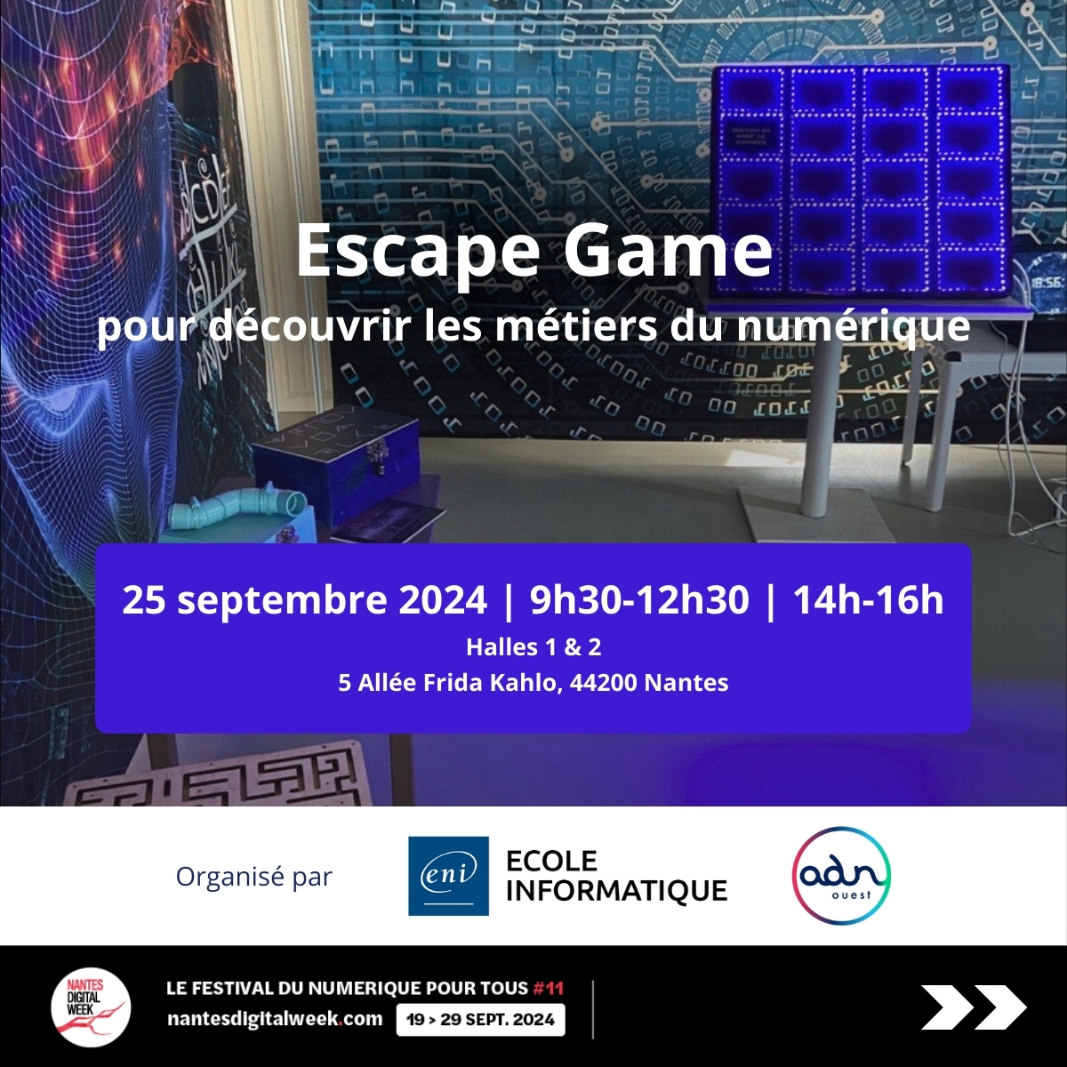 ENI Ecole Informatique et ADN Ouest vous proposent également une façon ludique de découvrir ces nombreux métiers du numérique sous la forme d’un Escape Game ! Ouvert à toutes et tous, cette expérience vous fera explorer de nombreuses facettes de l’informatique, du développement à la cybersécurité. Saurez-vous vous (ré)orienter ?