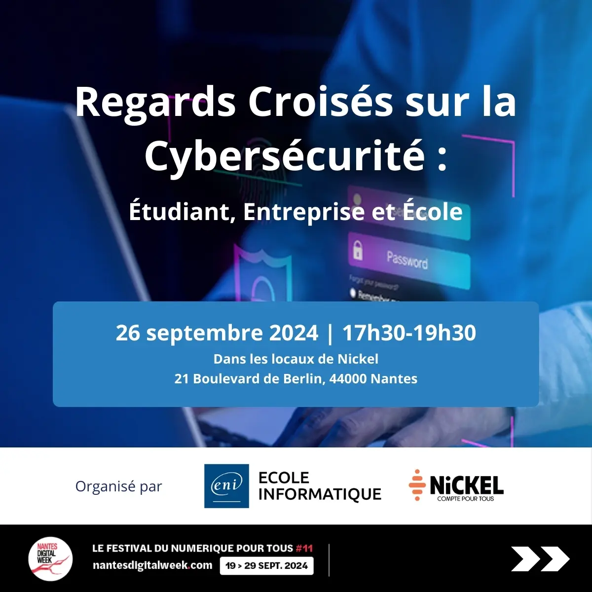 La Nantes Digital Week est aussi une occasion de croiser les expériences et regards sur le Numérique. C’est exactement l’objectif de cette table ronde proposée par ENI Ecole informatique et Nickel : notre plateau réunit un alternant, un représentant d’une entreprise pionnière de la cybersécurité et un formateur de notre école pour éclairer cette thématique sous tous les angles.