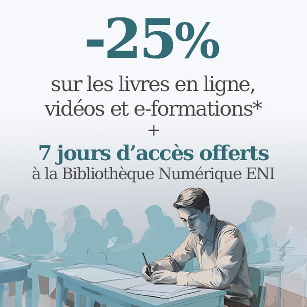 Pour en bénéficier, renvoyez-nous vos coordonnées complètes (y compris votre adresse e-mail pour recevoir le code d'accès à votre livre en ligne), et l'ISBN de votre livre (ex : 978-2-7460-XXXX-X) accompagnées de votre preuve d'achat par e-mail à LivreNumerique@eni.fr ou par courrier à l'adresse : Editions ENI, Offre Livre en ligne, BP 80009, 44801 Saint-Herblain Cedex, France.